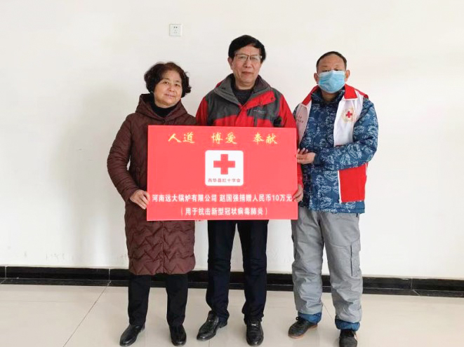 獻(xiàn)愛(ài)心,赴國(guó)難,共克時(shí)艱,河南遠(yuǎn)大鍋爐有限公司董事會(huì)力助新型冠狀病毒疫情防控,捐款10萬(wàn)元。近期武漢疫情加重,漫延全國(guó),為打贏疫情這場(chǎng)看不見硝煙的戰(zhàn)爭(zhēng),盡一個(gè)民營(yíng)企業(yè)的一份責(zé)任,公司董事長(zhǎng)、黨支部書記趙國(guó)強(qiáng)和家屬特意開車回到西華向西華縣紅十字會(huì)捐款10萬(wàn)元,用于新型冠狀病毒感染肺炎疫情防控工作,趙國(guó)強(qiáng)表示遠(yuǎn)大鍋爐將繼續(xù)關(guān)注并支持疫情防治工作,積極踐行企業(yè)社會(huì)責(zé)任。